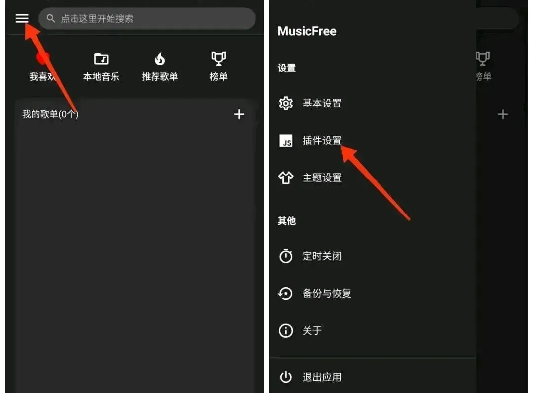打开MusicFree后→点击左上角的菜单按钮→选择“插件设置”。