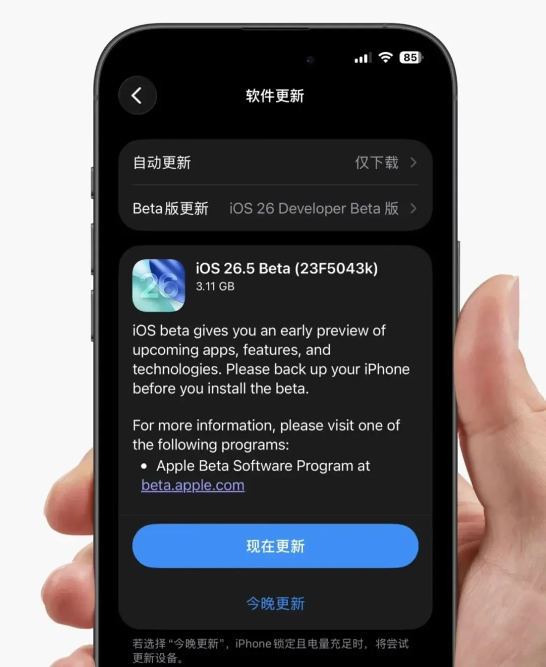 苹果紧急发布:iOS 26.5 系统更新升级!iPhone系统再次迎来更新升级!苹果今天凌晨紧急发布了iOS 26.5 Beta 1修订版系统更新,系统版本号为23F5043k;此次修订核心定位为“紧急修复+稳定性校准”,界界体验下来,没有看到什么新功能出现;升级建议:已安装iOS 26.5 Beta 1的用户,建议立即升级至修订版V2,可以提升安全性与稳定性;主力机用户、微信重度使用者就不建议升级了,避免残留Bug影响日常使用。