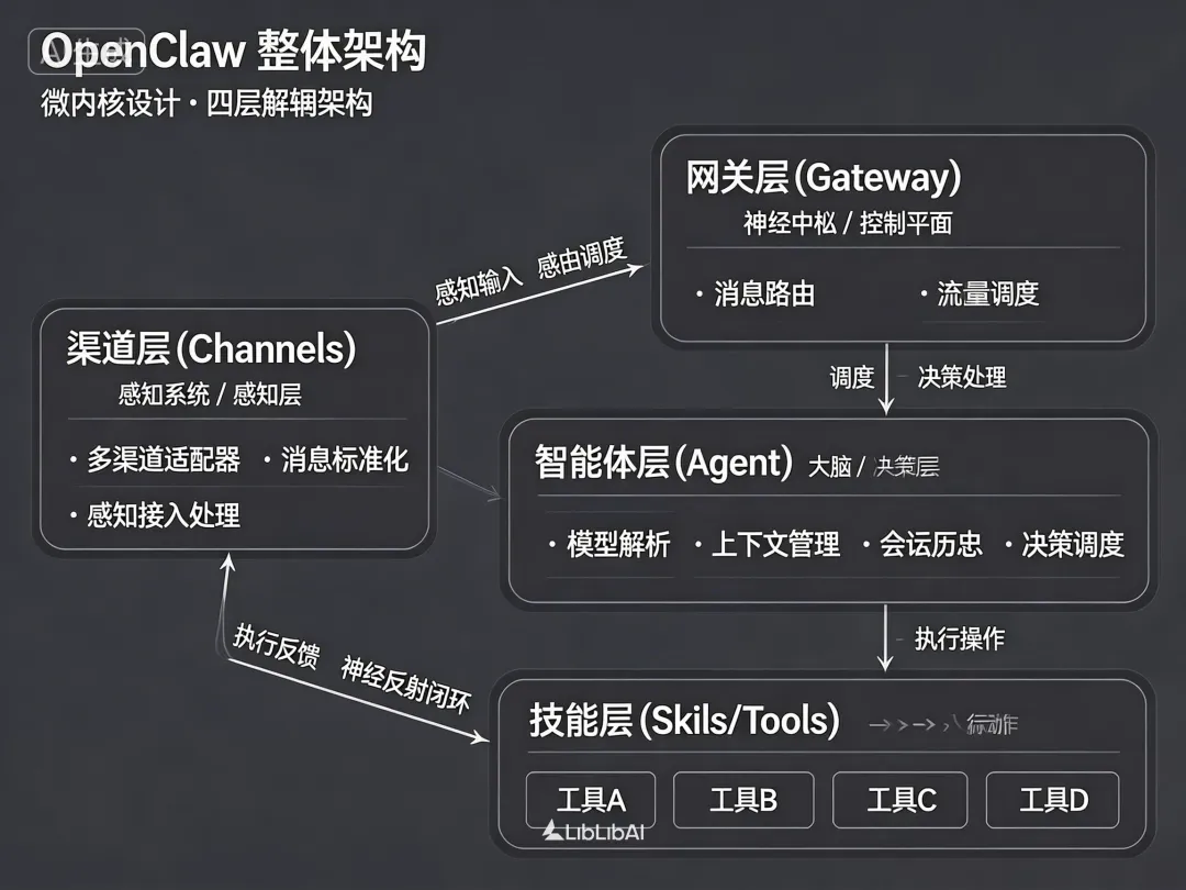 网关层(Gateway) —— 神经中枢 / 控制平面渠道层(Channels) —— 感官系统 / 感知层智能体层(Agent) —— 大脑 / 决策层技能层(Skills/Tools) —— 执行系统 / 行动层这四层的职责划分极其清晰:感知、路由、决策、执行,各司其职,互相解耦。任何一层出了问题,都能快速定位,不会相互污染。