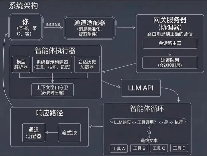 ① 消息入口用户通过聊天应用输入指令(比如「帮我搜一下最新 AI 论文」)。渠道适配器捕获消息,转换为标准化的内部指令格式。