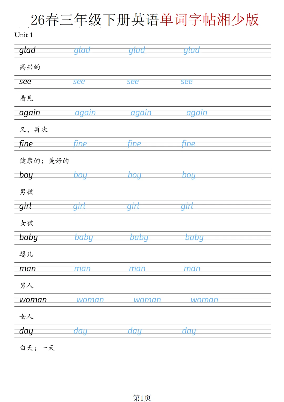三年级(下)英语 26春单词字帖《湘少版》