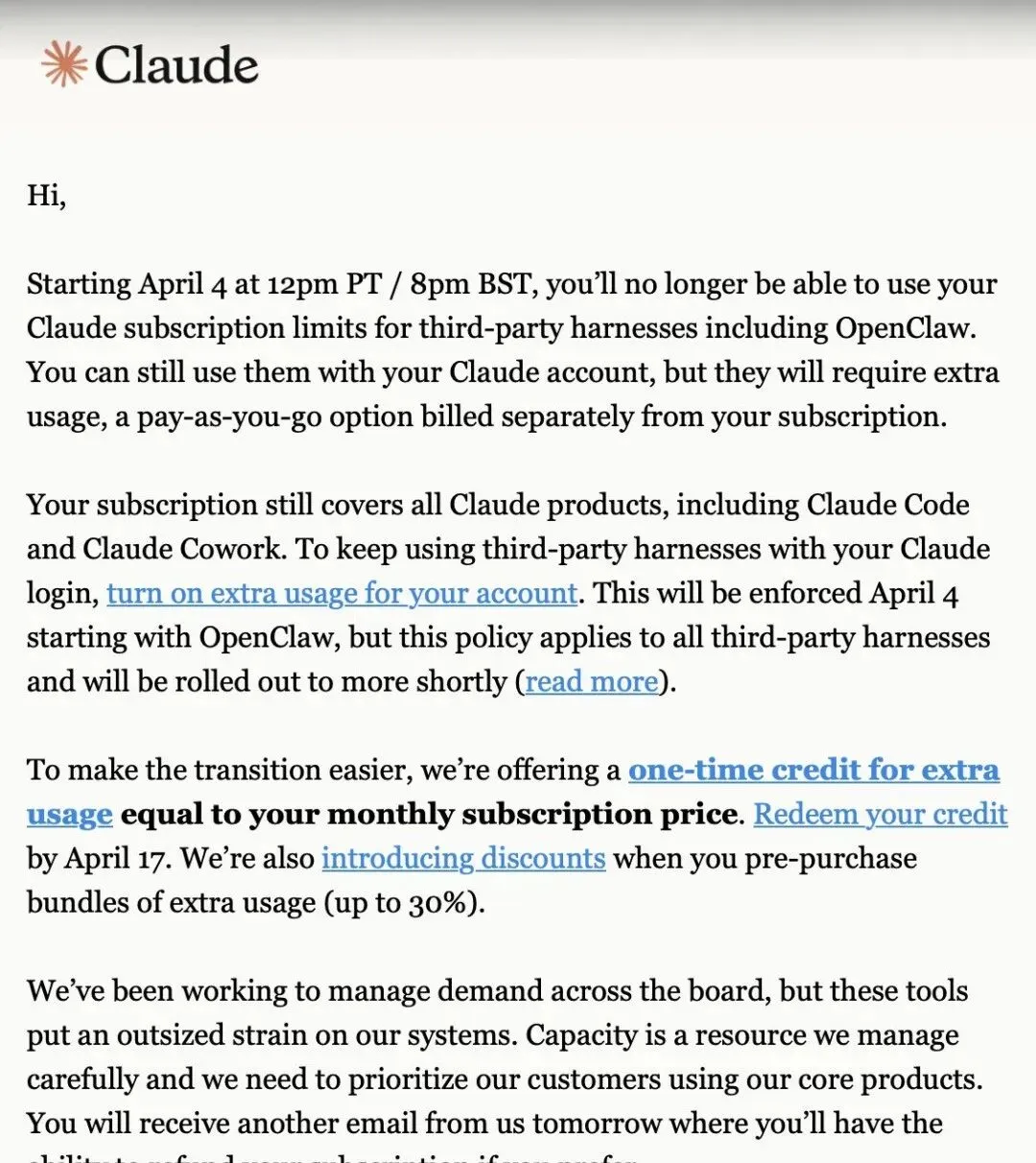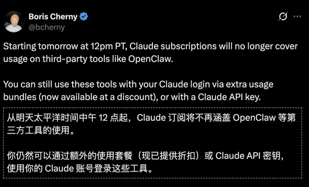就在今日,Anthropic 旗下 AI 编程工具 Claude Code 的负责人 Boris Cherny 正式宣布:从美国西部时间 4 月 4 日中午 12 点起,Claude 的订阅服务将彻底切断对 OpenClaw 等第三方工具的使用额度。