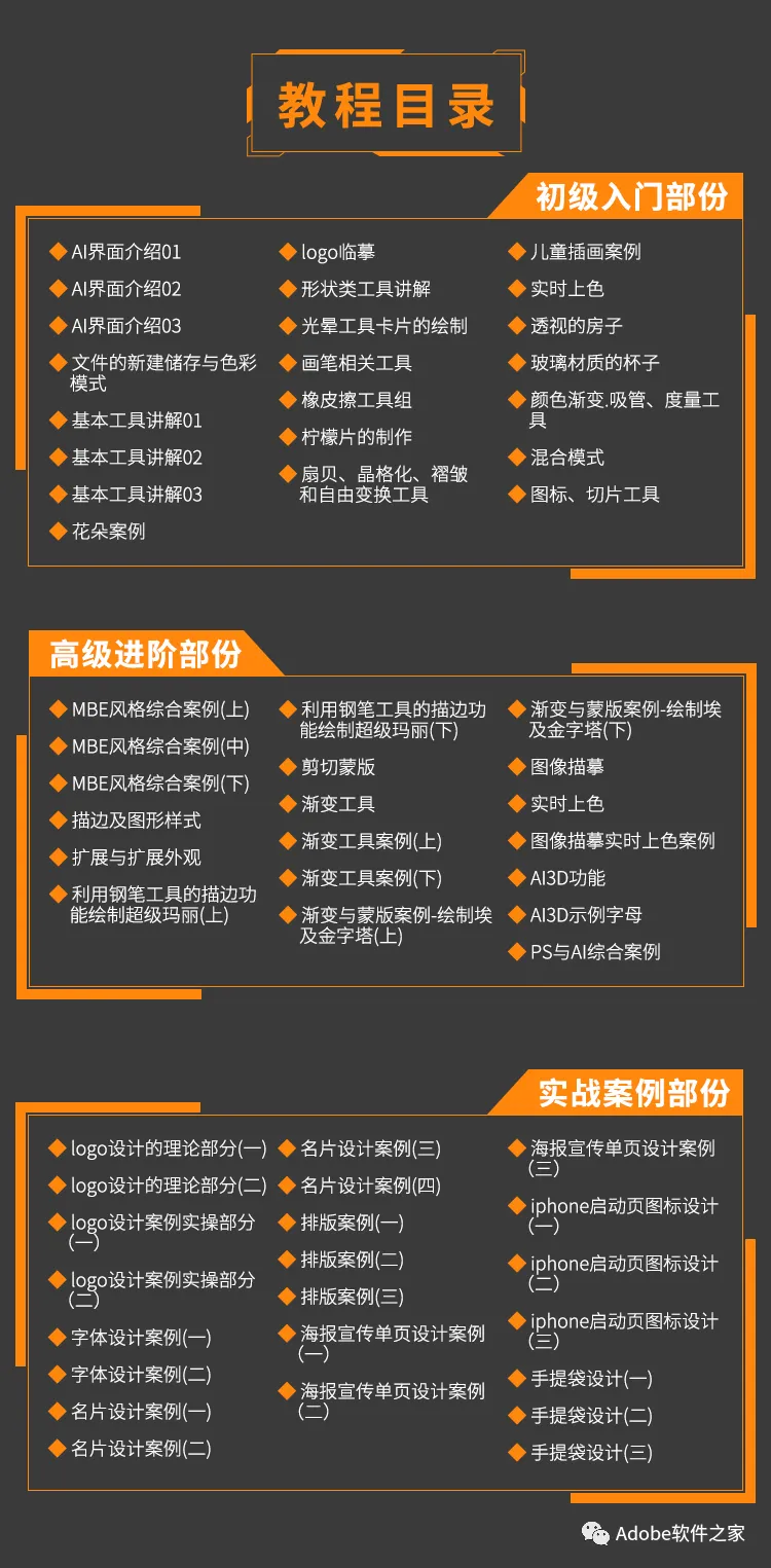 下面推荐一套非常不错的Ai视频教程,以Ai2019软件为教学样本,各个版本的Ai通用,从基础到精通,还包括字体设计,Logo设计,UI设计,海报设计,包装设计,图文排版等。有需要的可以看一下教程目录。(有需要的可以联系:人工客服,只需30元)