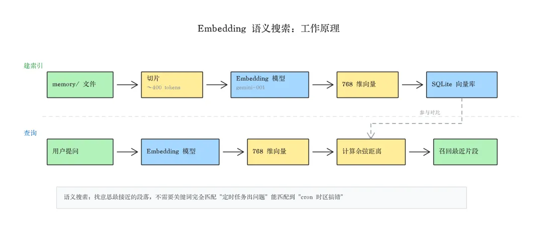 你往 memory/ 里写了一个文件,比如记录了"上次 cron 配置时区搞错,凌晨的推送跑到了中午" OpenClaw 把这段文字切成小片段(大约 400 tokens 一块),发给 embedding 模型(我用的是 Google 的 gemini-embedding-001),模型给每个片段返回一组 768 个数字 这组数字存进本地的 SQLite 向量数据库 下次你问助理"之前定时任务出过什么问题",这句话也会被转成一组 768 个数字 系统在向量库里算距离,找到"意思最接近"的几个片段,返回给助理