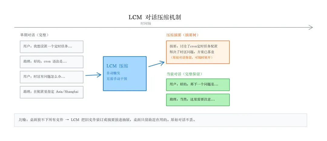 打个比方:你的工位只有一张桌子,放不下所有文件。LCM 做的不是把旧文件扔进垃圾桶,而是把它们装订成摘要放进抽屉,桌面只留最近在用的。抽屉里的东西随时能拿出来翻。