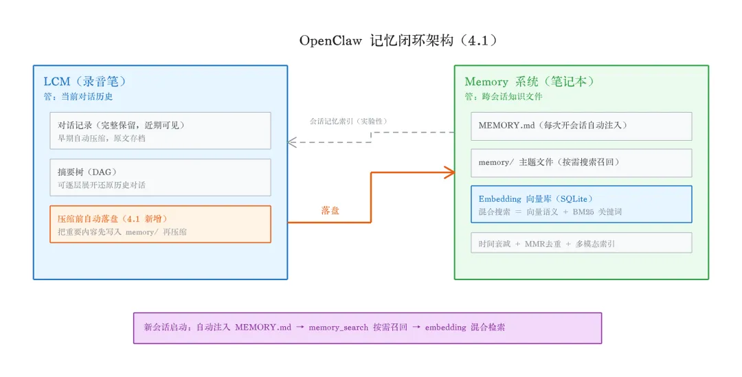 4.1 让这套系统从"各管各的"变成了"配套联动"。混合搜索让检索更准,压缩前落盘让两套系统有了交汇点,会话记忆索引让搜索边界不再割裂。如果你之前配过记忆系统但觉得效果一般,升级到 4.1 之后值得重新试一下。