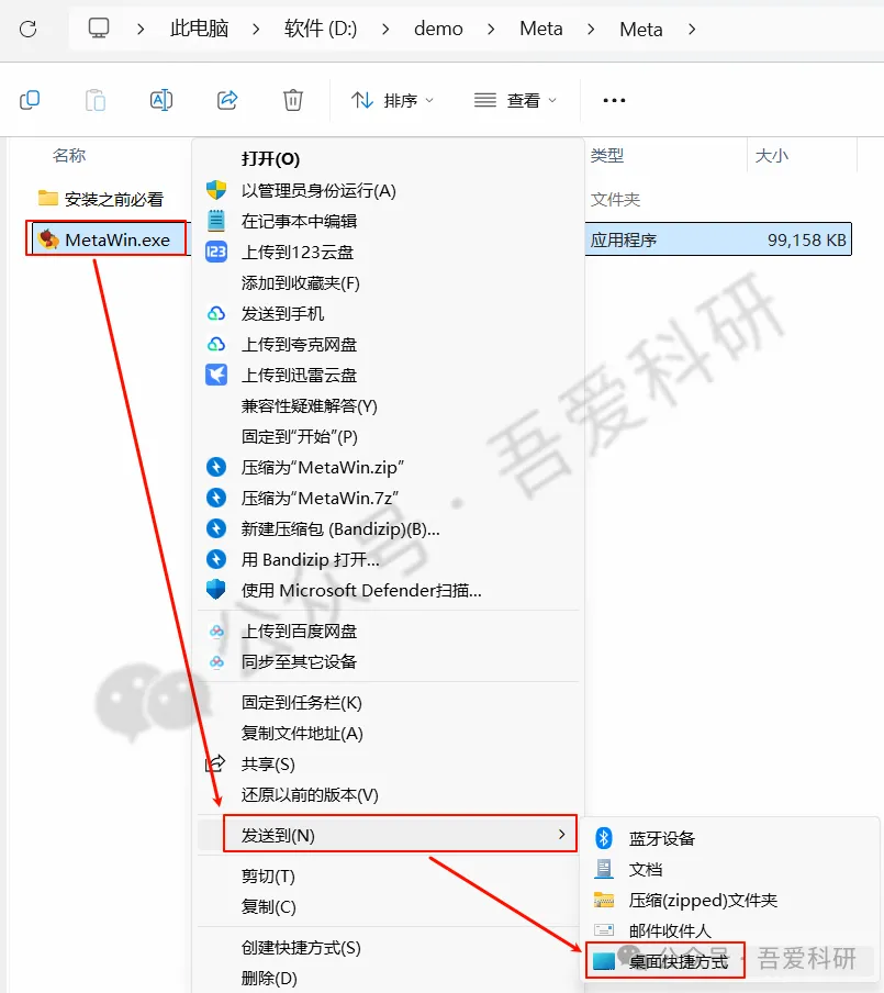 2.选中“MetaWin.exe”发送到桌面快捷方式(安装包不能放在中文路径下,否则无法打开)