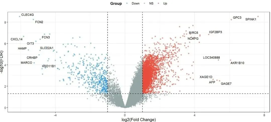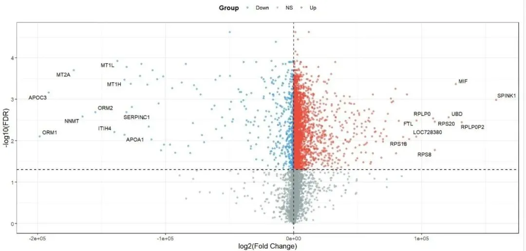 今天在对一个芯片数据做差异分析、绘火山图时,直接踩坑了 —— 出来的图完全没法看,太离谱了!X 轴范围直接飙到 -2e+05 ~ +1e+05,也就是从-20 万到+10 万;原本该分开的Up、Down 基因,全被挤压在 X 轴 0 点附近,所有点挤成一条竖线,压根分不清谁是上调、谁是下调,更别提看真实的表达倍数变化了。明明左侧标注的是下调基因(比如 MT1L、APOC3),右侧是上调基因(比如 MIF、SPINK1),但因为 X 轴异常,完全体现不出它们的表达差异,等于白做了一遍分析。