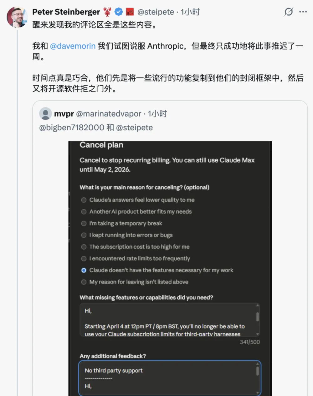 换句话说,是OpenClaw替Anthropic蹚了路。现在路蹚完了,Anthropic却顺手把桥拆了。