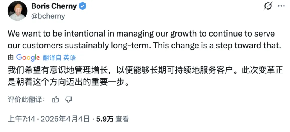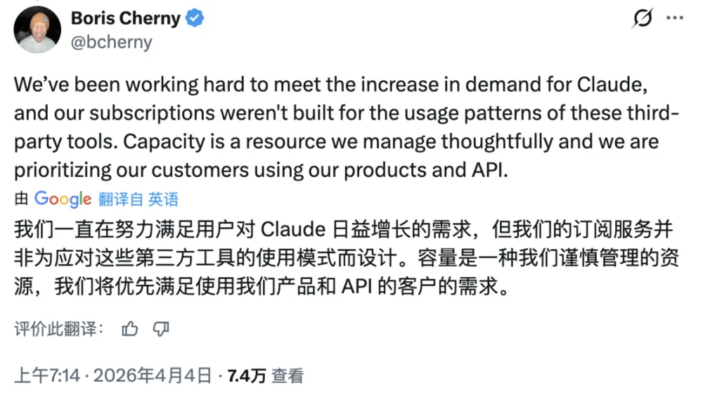 “我们一直在努力应对Claude需求的增长,而我们的订阅服务,本来就不是为第三方工具的使用模式设计的。算力是我们需要审慎管理的资源,我们要优先保障使用自家产品和API的客户。”