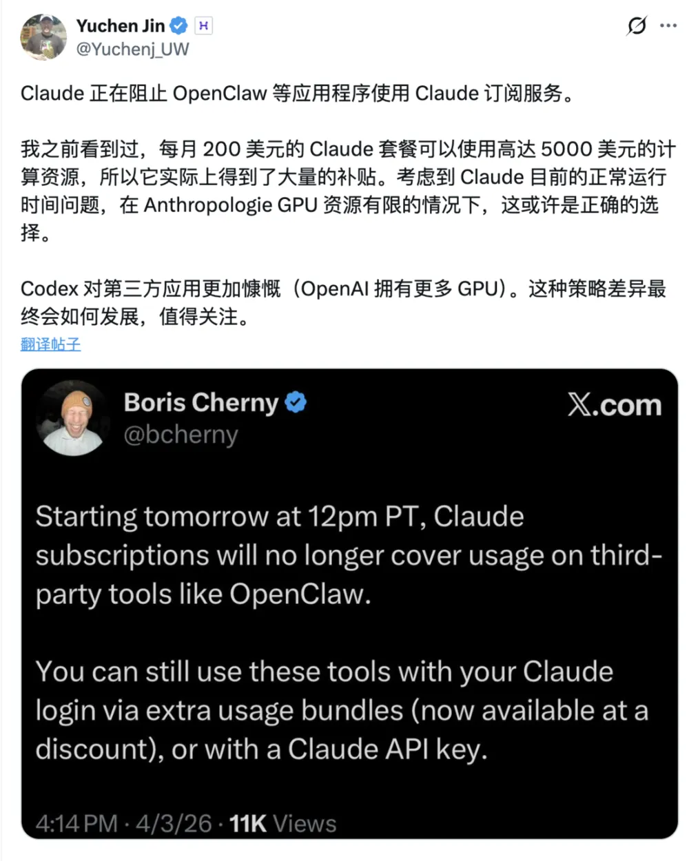 “明天中午12点PT起,Claude订阅将不再覆盖OpenClaw等第三方工具的使用。”