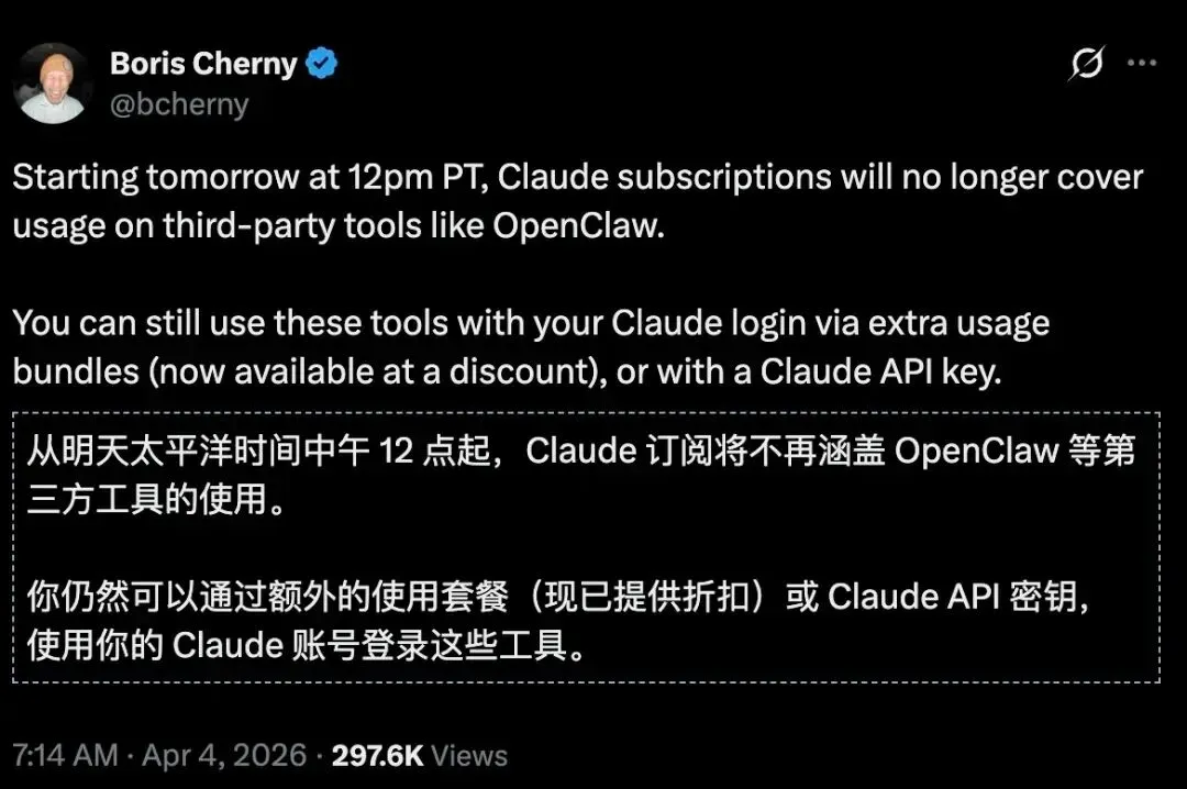就在今日,AI行业迎来一记重锤。Claude母公司Anthropic正式发出通牒:从太平洋时间4月4日中午12点起,所有Claude订阅用户将无法再使用月费额度访问OpenClaw等第三方工具。这意味着,成千上万依赖OpenClaw实现自动化工作流的开发者,一夜之间从"包月无限量"的舒适区,被抛进了按量计费的昂贵深渊。