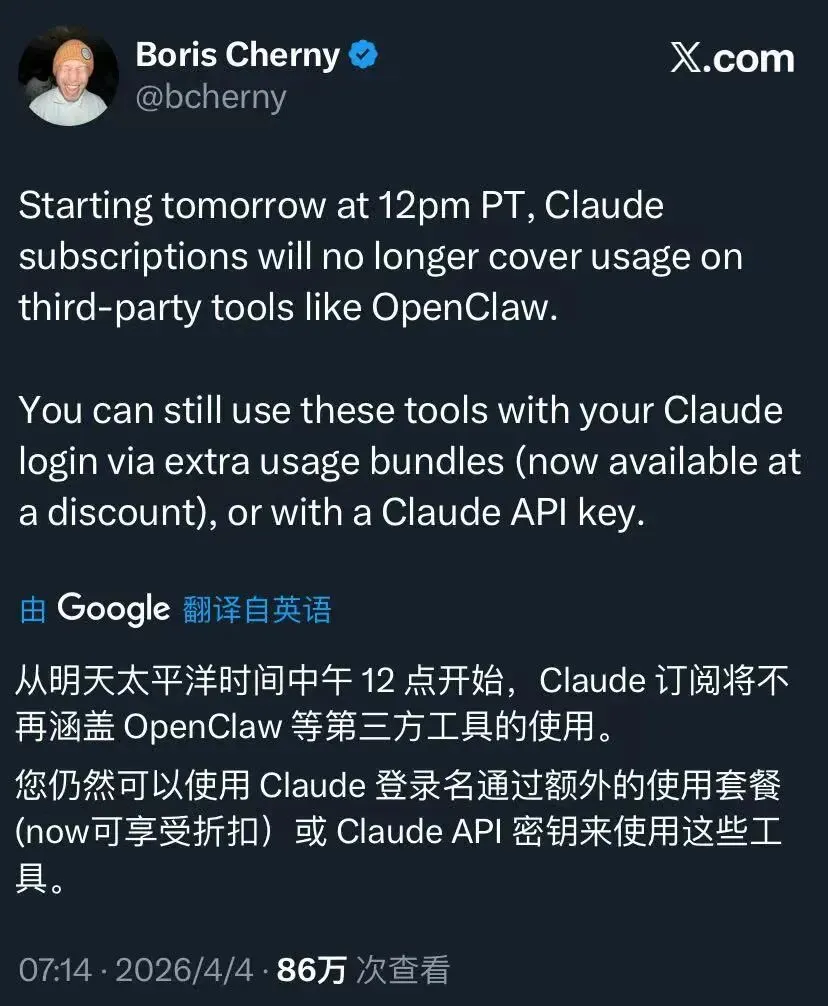 今天一刷公众号文章,Claude 将从 4 月 4 日 12 点开始,不再支持 OpenClaw 使用。