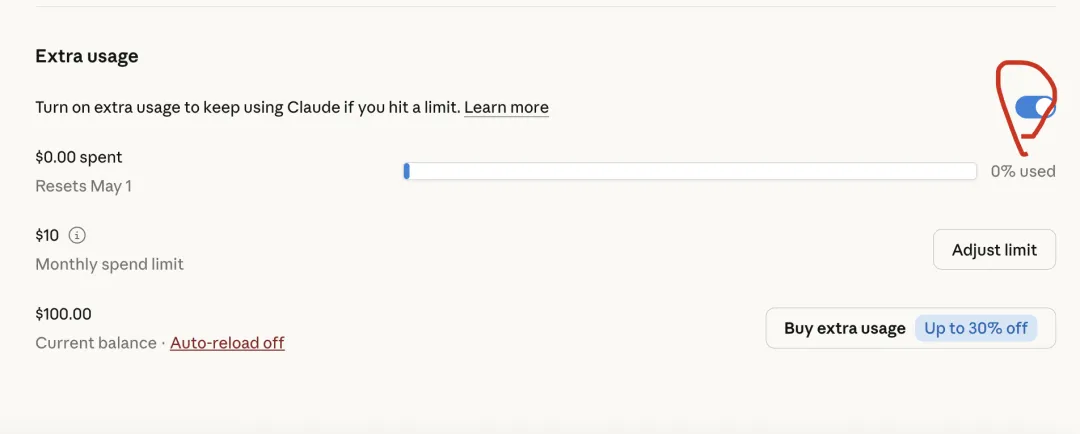 1、进入设置 → 用量页面,打开"额外用量"开关