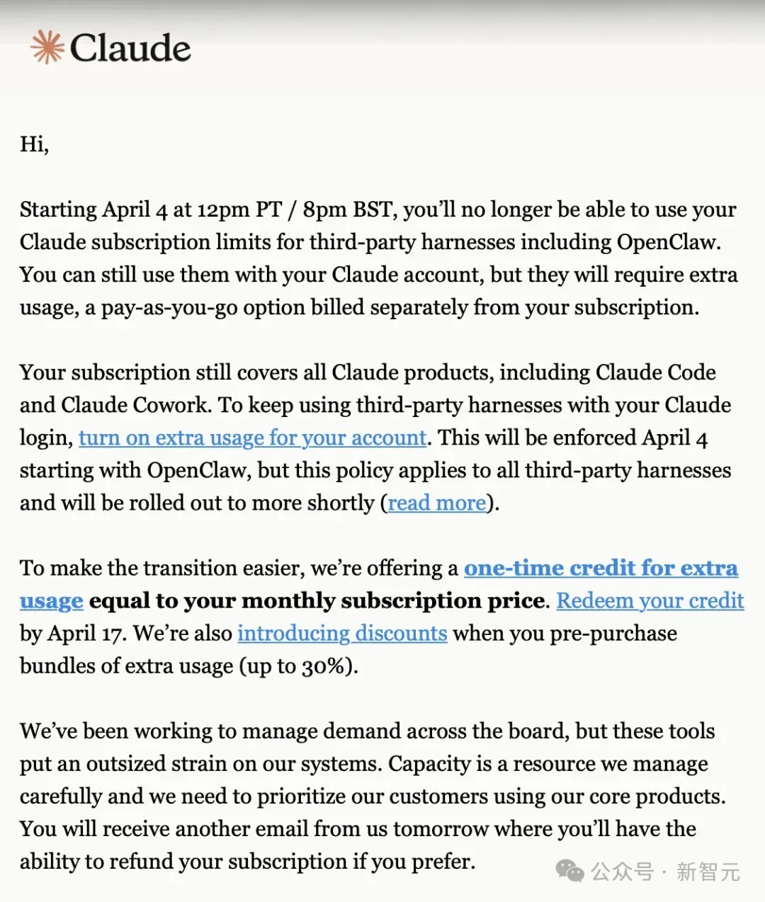 4月4号,Anthropic宣布,Claude订阅服务以后不再支持OpenClaw等第三方工具,用户如果想继续使用,必须开API或者按量付费。很多人第一反应是——算力压力大?没错,但更深层的原因,是谁掌控算力、谁掌控用户、谁掌控数据。