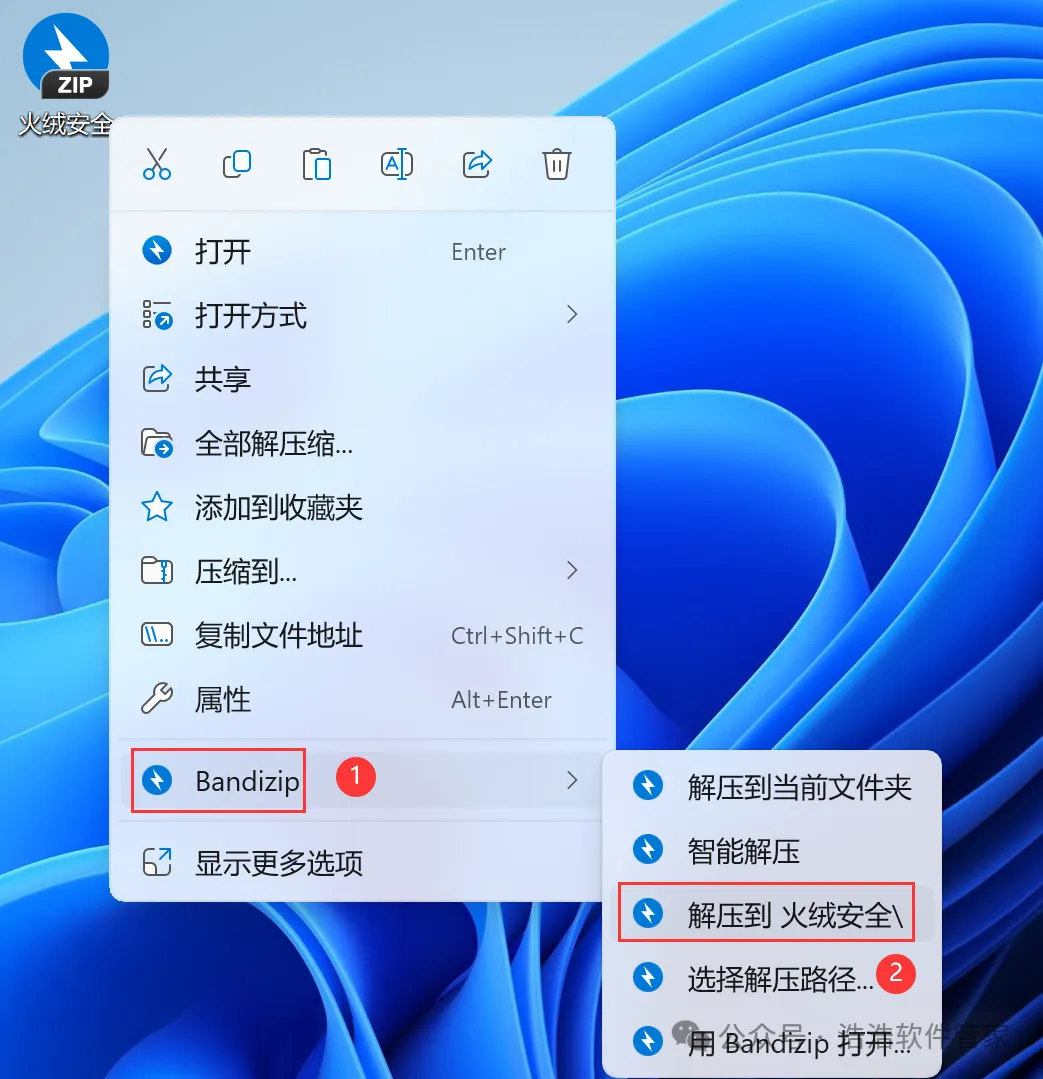 1、下载火绒安全软件安装包到电脑上,右键选择【解压到火绒安全\】