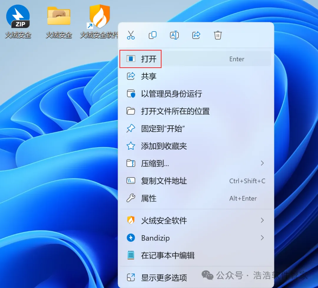 8、回到桌面,右键桌面上的【火绒安全软件图标】,点击【打开】