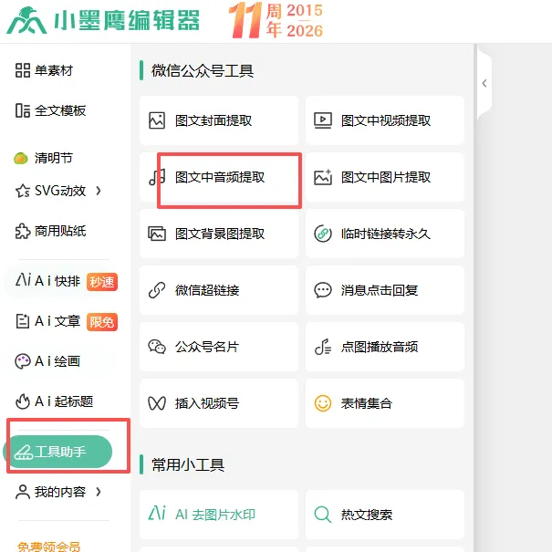 找到工具入口后,里面有一个“图文中视频获取”功能,可以用于提取音频视频。