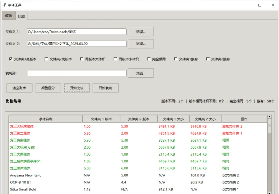 2、颜色区分: 版本不同(红色),体积不同(橙色),完全相同(绿色),独有字体(黑色)