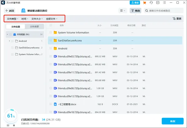 在扫描过程中,您可以在不同的方式之间切换以过滤、选择和精确定位要恢复的文件。方式分别为“文件类型”、“时间”、“文件大小”和“所有文件”。设置过滤器后,程序将加载与您想要的匹配的搜索结果。