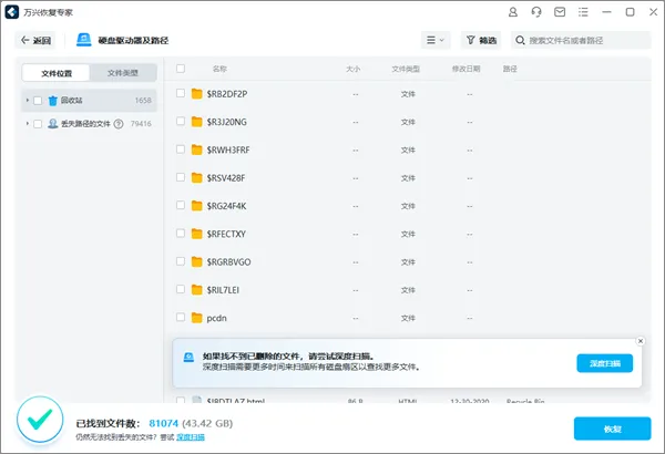 全面扫描后,如果还是没有得到想要的结果,可以使用深度扫描模式,从回收站中挖掘出更多丢失的数据。
