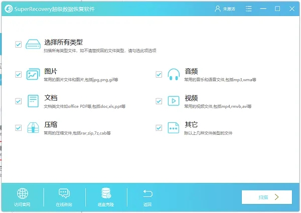 3、选择我们需要扫描恢复的文件类型,当然全选是最好的。反正扫描恢复很快的,选中[扫描]即可。
