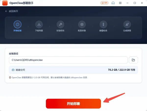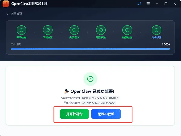 1、环境没问题之后,直接点击“一键部署”。它会自动完成下载OpenClaw核心程序、安装依赖包、配置运行环境、初始化项目文件。
