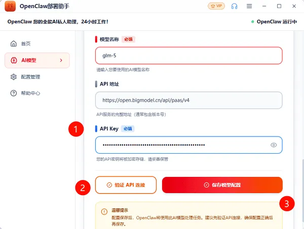 部署完成后,点击“配置AI模型”。这一步其实决定了OpenClaw“聪不聪明”。进入“模型配置”页面,我们需要选择模型并填写对应的API Key。操作逻辑很简单: