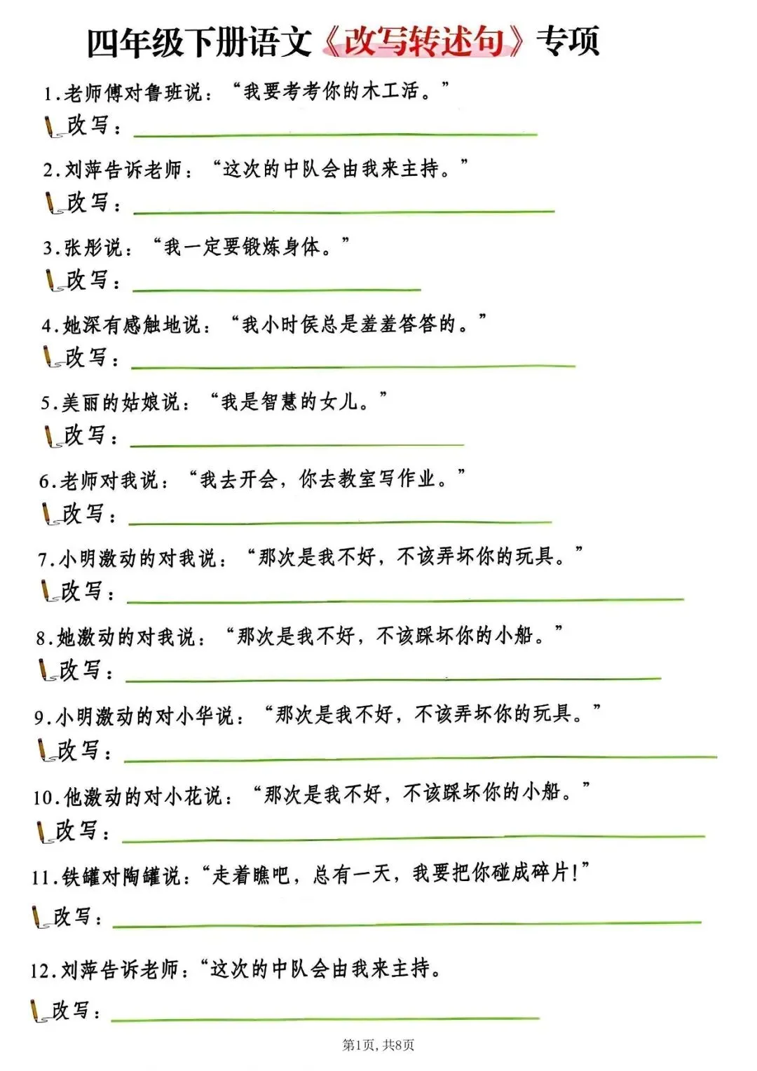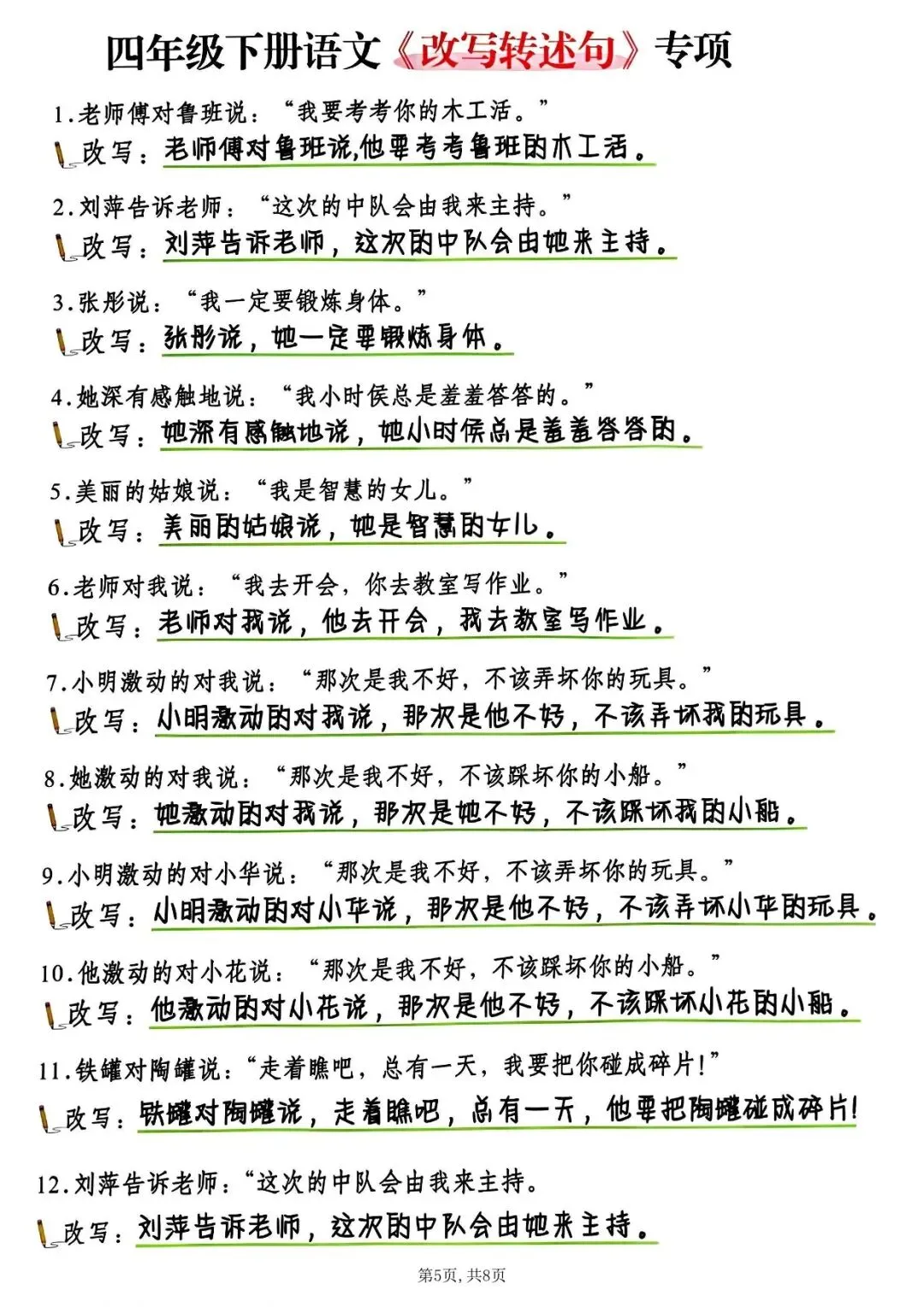 本资料同步部编版四年级下册语文句式考点,专为反问句改陈述句、双重否定句改陈述句两大必考题型设计,是期中、期末句子专项必练内容。包含方法口诀 + 例句精讲 + 阶梯练习 + 答案,重点攻克标点、否定词、疑问词、语气词四大易错点,题型由基础到拔高,可直接打印使用,帮助学生快速掌握改写规则、不丢句式分,是句子专项复习、考前冲刺的优质练习资料。