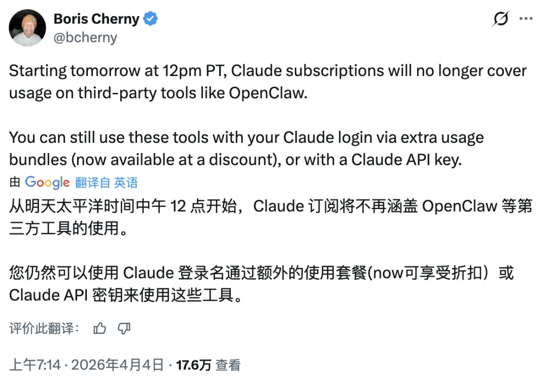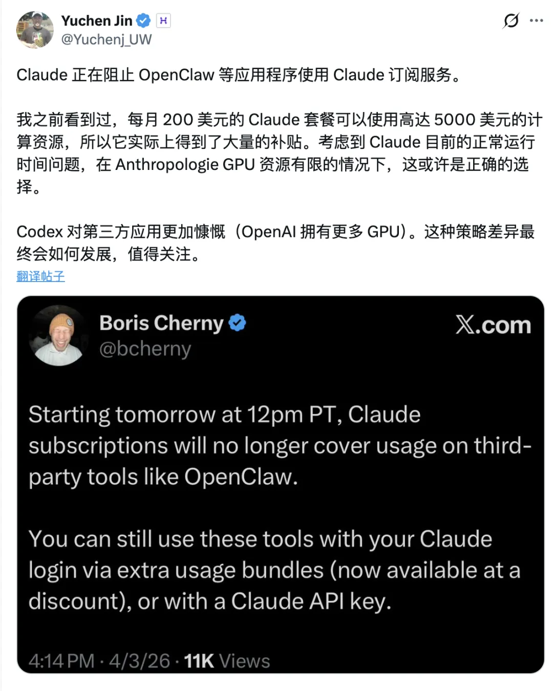 Anthropic 终于对 OpenClaw 下手了!订阅不再允许使用,龙虾之父说服失败就在刚刚,Anthropic 宣布「封杀」OpenClaw。很多 OpenClaw 用户的邮件收件箱,悄悄多了一封邮件,邮件内容不长,但信息量很大:从太平洋时间 4 月 4 日起,用户将无法再使用您的 Claude 订阅额度访问包括 OpenClaw 在内的第三方工具。想继续用?以后有两条路。要么购买额外的「使用包」;要么自备 Claude API Key,按量付费。补偿是有的:一次性等额月费积分,折算成你的月订阅费。想要全额退款,明天的退款邮件里找链接。消息一出,OpenClaw 创始人 Peter Steinberger 在社交媒体上留下了几句颇为辛酸的话:「我和 Dave Morin 尽力去说服 Anthropic,最终只是成功将此事推迟了一周。时间点真是巧合,他们先是将一些流行的功能复制到他们的封闭框架中,然后又将开源软件拒之门外。」「我是用 Claude 造的」OpenClaw 能火,本身就是一个离谱的故事。创始人 Peter Steinberger,iOS 开发界的传奇人物,PSPDFKit 的创始人,按理说代码功力深不可测。然而做 OpenClaw,他给自己定的角色是:产品经理。整个 OpenClaw 的代码,包括后端、前端、CI/CD、测试、文档,全部由 Claude Code 自动生成。Peter 本人只负责用自然语言描述需求。一行代码都没亲自写过。这个工具的底层技术,也全是 Claude 的:超长上下文、Agent 工具调用、多步骤推理规划。从灵魂到骨架,它本身就是脱胎于 Claude。然而,Anthropic 还是动手了。其实在这次封杀之前,两家的恩怨早就开始了。OpenClaw 最初叫什么?Clawdbot,缩写 CLAWD.。Anthropic 看了,不乐意:你这个名字和 Claude 太像了,改掉。于是先改成 Moltbot,最后才定名 OpenClaw。改完名,两家短暂和平。然后 OpenClaw 全网火了了。管理收件箱、管日历、帮你值机……用户说,这玩意儿真的能跑起来。一个账号,同时跑十个 Agent,全天候不停机。200 美元的的 Claude Max 订阅,有人测算,实际可调用的算力价值高达 5000 美元。相当于 Anthropic 在大幅补贴每一个重度用户。而 OpenClaw 用户,偏偏都是最重度的那批。放到 Anthropic 的服务器上,就是一个吸血泵。于是这个矛盾,终于还是在今天爆发了。创始人跑路去了 OpenAI让故事更精彩的,是 Peter 本人的去向。年初,OpenAI 把他挖走了。这意味着什么?OpenClaw 这个深度依赖 Claude 的工具,创始人现在效力的是 Anthropic 最直接的竞争对手。Anthropic 看着这个局面,心里的感受,大概是五味杂陈的。对于此次风波,Anthropic Claude Code 负责人 Boris Cherny,连发四条推文,亲自出来解释。第一条直接宣布政策:「明天中午 12 点 PT 起,Claude 订阅将不再覆盖 OpenClaw 等第三方工具的使用。」然后紧接着第二条,说原因:「我们一直在努力应对 Claude 需求的增长,而我们的订阅服务,本来就不是为第三方工具的使用模式设计的。算力是我们需要审慎管理的资源,我们要优先保障使用自家产品和 API 的客户。」翻译成人话就是:你们薅得太狠了,我们的机器扛不住,先顾自己人。第三条说补偿:「订阅用户将获得一次性等额月费积分。如果需要更多,现在可以购买折扣使用包。明天的邮件会包含申请全额退款的链接。」第四条收尾,画风也变得很官方:「我们希望有意识地管理增长,以长期持续地服务好我们的客户。这次变化是迈向这一目标的一步。」只是网友却吵翻天了,博主 Yuchen Jin 认为:「200 美元/月的 Claude 补贴力度惊人。考虑到 Claude 近期的稳定性问题,在 Anthropic 当前的 GPU 算力约束下,这一调整可能的确是正确的选择。」他还往更长远的方向思考:「Codex 现在对第三方工具还算慷慨,毕竟 OpenAI 的 GPU 储备更充裕。两家在策略上的分化,真的开始显现了。接下来看谁撑得住。」博主 Peter Yang 则表示:Anthropic 和 OpenAI 现在都在用 100-200 美元/月的订阅价格,亏本补贴那些全天候跑多个 Agent 的重度用户,活脱脱就是当年 Uber 和 Lyft 疯狂烧钱抢市场的翻版。而后来的故事大家都知道,两家上市之后票价几年内近乎翻倍,Uber 从创立到首次盈利更是耗了整整 14 年。他的判断是,OpenAI 和 Anthropic 上市都不远了,财务数据一公开,这些亏本订阅计划必然撑不住,要么涨价要么限流,顺带还补了一刀:「Mac Mini 和 Mac Studio 跑本地模型,现在看起来越来越香了。」(doge)蹚完路,桥拆了成本之外,Anthropic 封掉 OpenClaw,还有更深层的用意。是的,Anthropic 正在同时在力推 Claude Code 和 Claude Cowork。OpenClaw 的控制面建立在 WhatsApp、Discord、Telegram 等聊天应用上。用户在聊天框里打字,OpenClaw 就去执行。在你的电脑上 24 小时运行,自动回复消息、管理日程、读写文件、执行代码。但回到技术内部,OpenClaw 本身不是模型,它是一个框架,一个「虾壳」。驱动它的智能,很大程度上来自 Claude 的模型能力和 Claude Code 的 CLI 接口。OpenClaw 用户中最活跃的那批顶级玩家,多数都在调用 Anthropic 的 API——只要付得起 token 钱即可。Anthropic 显然看到了这一点。从早期以商标版权为由抗议「Clawdbot」这个名字,到近两个月内密集发布四项新功能——每一项,都精确对标 OpenClaw 的一个核心能力:OpenClaw 通过 WhatsApp 消息充当文本代理,在桌面端运行。Anthropic 的回应是 Dispatch,手机到桌面的持久线程。OpenClaw 用 Discord 和 Telegram 作为控制面。Anthropic 发布了 Claude Code Channels,用 MCP 协议桥接两端。OpenClaw 提供完整的操作系统访问权限、浏览器控制、应用程序操作。Anthropic 的对应版本是 Computer Use 和 Claude C