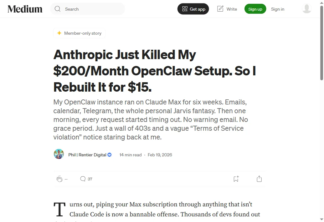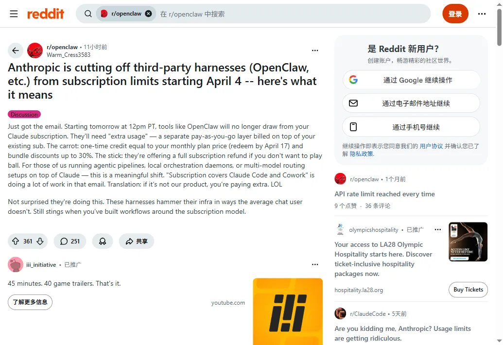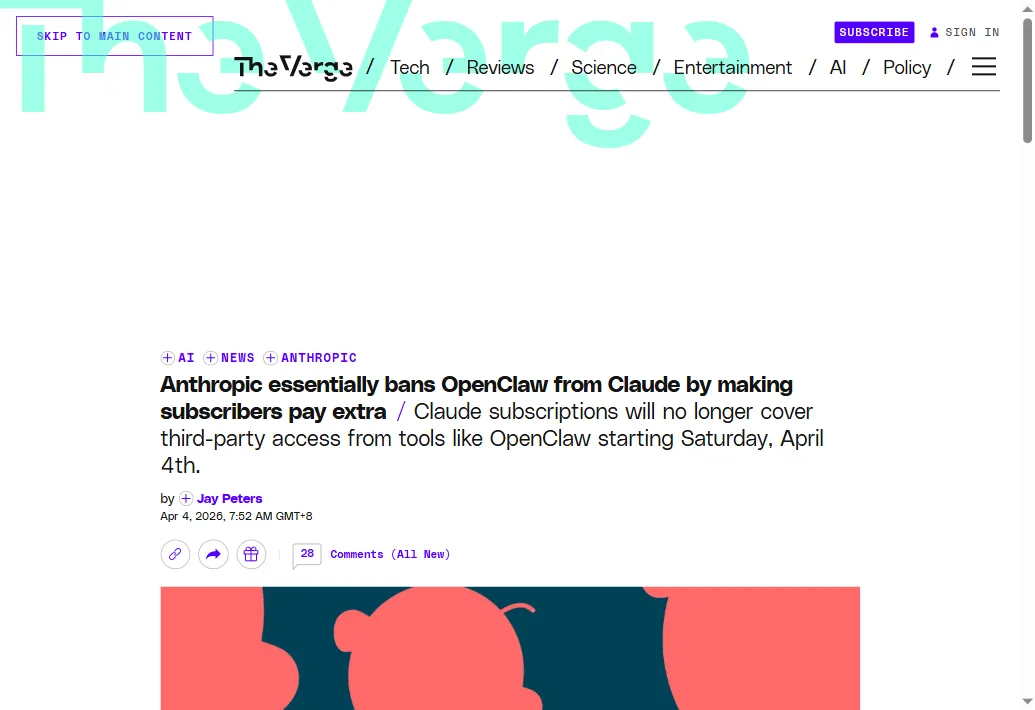 OpenClaw被Anthropic强制断供,月费从20刀飙到200刀昨天晚上,刚用OpenClaw跑完一个文案任务,准备关电脑。临关之前,刷了一眼X。然后看到Anthropic发了一个公告,给我整愣了。Claude订阅,从今天起,不再覆盖OpenClaw等第三方工具的用量了。也就是说,你花20刀买的Claude Pro,以前可以在OpenClaw里随便用。从今天中午开始,这条路堵死了。想继续用?额外掏钱,按量付费。今天就来聊聊这个事。01刀到200刀,到底发生了什么?Anthropic的Claude Code负责人Boris Cherny昨天发了公告:从4月4号中午(太平洋时间)起,Claude订阅不再覆盖第三方工具的用量。你还可以用Claude账号登录OpenClaw,但用量不再从你的订阅额度里扣,而是单独计费。官方理由是"为了更好地管理容量"。翻译成人话就是——OpenClaw用户太能用了,token消耗量比Claude Code用户高出好几倍,Anthropic扛不住了。这事其实不是突然的。早在1月9号,Anthropic就悄悄封过一次OAuth令牌,直接在服务端做了限制,没发任何通知。2月18号又在官方文档里明确写了"禁止用订阅令牌接第三方工具"。只不过那两次都是偷偷来的,这次是正式通知——而且只提前了一天。Reddit上已经炸了。有人说"刚把工作流全迁到OpenClaw+Claude上,现在突然要加钱"。有人算了一笔账,说之前花20刀订阅就能在OpenClaw里随便用Claude,现在这些用量要单独按API收费,一个月下来可能要200刀以上。还有人更狠,直接在帖子下面甩了一句:提前一天通知就封?Anthropic你是做AI的还是做PUA的?不过也有理性的声音。Hacker News上有个高赞回复说:这迟早会发生,订阅本来就不是给API用的。第三方工具白嫖订阅额度,本质上是在薅平台的羊毛,平台堵漏洞无可厚非。你会发现,这事确实两面都有道理。02跟你有多大关系?3种情况对号入座第一种,你只用Claude.ai网页版或者Claude Code不受影响,该咋用咋用。这次调整只针对第三方工具,跟你没关系。第二种,你跟我一样,在OpenClaw里接了Claude来跑任务那你今天就得去检查一下。看你的用量是走订阅还是走API。如果走的订阅OAuth令牌,今天中午之后就断了。我昨晚看到消息之后,第一反应就是去查我自己的配置。还好,上次写完那篇漏洞文章之后,我已经把OpenClaw切到API Key模式了。所以这次对我影响不大。但如果你还在用订阅模式——赶紧切。第三种,你还没入坑OpenClaw,正在观望那这件事反而帮你省了一笔试错费。因为入坑的成本提高了,你可以先观望一下,看看社区有没有更稳妥的方案再动手。03刀降到15刀,替代方案已经有人跑通了其实已经有人在搞替代方案了。我看到有个老哥在Medium上写了篇文章,说他把原来200刀/月的OpenClaw+Claude方案,重建到了15刀/月。怎么做的呢?两台5刀的VPS做冗余,主力模型换成Kimi K2.5,备用模型用MiniMax M2.5。模型能力肯定比不上Claude,但他说对于日常的文案生成、代码辅助这些普通场景,够用了。国内也有人在推通义千问、豆包这些国产模型的平替方案。阿里云开发者社区甚至出了一篇完整的"合规部署OpenClaw+国内大模型"的教程。所以你会发现,路不是只有一条。Claude关了门,其他模型在开窗。04"免费午餐"时代,正在一个一个结束上篇文章刚聊完OpenClaw的安全漏洞,17万实例中招。这篇又碰上Anthropic断供。这两件事放在一起看,其实指向同一个趋势——AI工具的"免费午餐"时代,正在一点一点结束。以前各家烧钱抢用户,什么都免费、什么都能白嫖。现在用户量上来了,商业化的大门一扇一扇关上。这不是坏事。工具成熟了,商业模式清晰了,说明这个行业在走向正轨。但对我们普通人来说,意味着一件事——你得越早熟悉这些工具越好。因为以后用的成本只会越来越高,不会越来越低。就像我当年刚开始学AI的时候,ChatGPT 3.5还是免费的。现在你再想用最好的模型?4o、Claude、Gemini,哪个不要钱?窗口期不等人。现在学,就是最便宜的时候。对了,最近很多人在问我 OpenClaw 怎么部署到云端。这个工具现在确实挺香的——我整理了一份云部署的落地资料, 关注我,回复「333」 ,免费发给你。