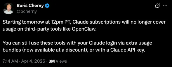 就在4月4日,Anthropic的Claude Code负责人Boris Cherny在X上发了一条推文: