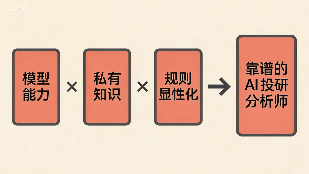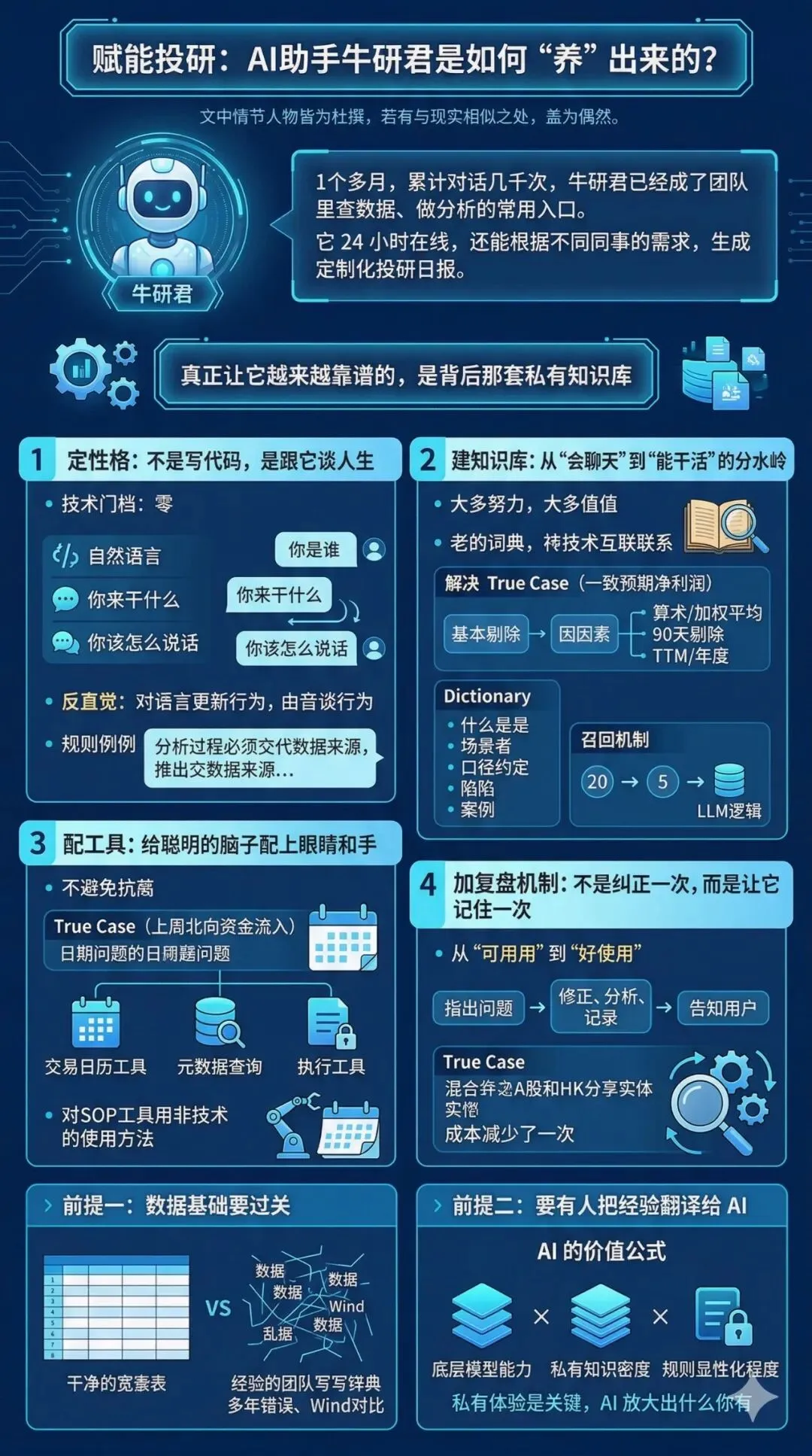 如果换一个没有投研经验的人照着四步做,搭框架、配工具他可能会,但那本字典他写不出来。他不知道哪个数据源有延迟、哪种口径容易误导投资判断。他能搭出牛研君的架子,却养不出靠谱的牛研君。