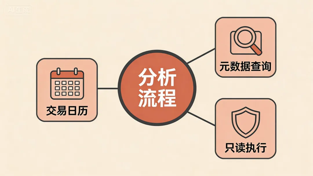 • 交易日历工具:统一时间口径,处理节假日与交易日歧义 • 元数据查询:动态调用数据字典,完成数据源筛选 • 执行工具:只读权限,只查不改,错误可控