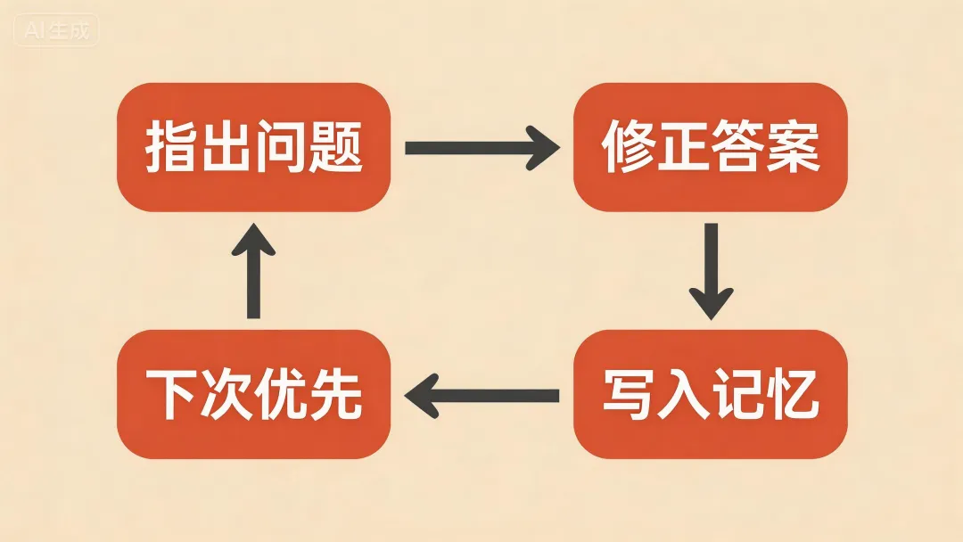 解决办法是在配置里加一条规则:只要用户指出问题,它必须做三件事,修正当前答案、分析这次错在哪里、把正确口径写进记忆文件,并告知用户“已记录,下次优先按这个口径处理”。