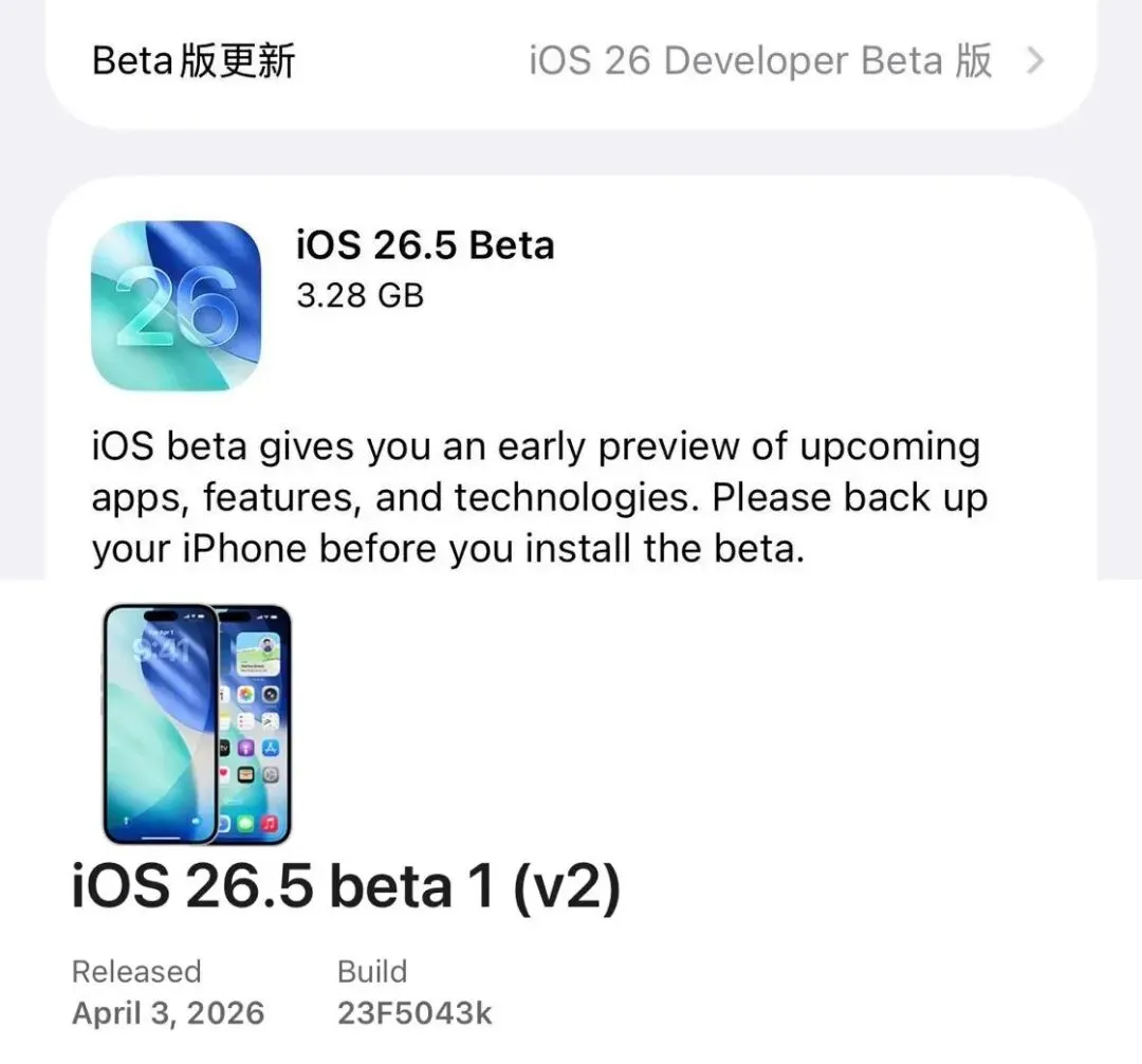 苹果发布iOSV2新系统更新!今日凌晨,苹果在推送 iOS 26.5 首个开发者测试版仅 4 天后,紧急补发 iOS 26.5 beta 1 (v2),版本号 23F5043k,安装包约 3.28GB,面向开发者用户推送。此次补发核心是修复初代 beta1 的致命问题:大量用户反馈微信、QQ 等主流 App 频繁闪退,部分机型还出现续航异常、键盘延迟等 bug,严重影响日常使用。v2 版本重点优化了 App 兼容性与系统稳定性,解决了初代版本的核心缺陷。iOS 26.5 beta1 本身带来多项更新:地图新增「推荐地点」、RCS 消息默认端到端加密、控制中心新增快速静音按钮、隐私页新增 7 天权限记录等,支持 iPhone 11 及以上机型。普通用户不建议升级测试版,已升级初代 beta 1 的开发者需尽快更新 v2,以获得更稳定的使用体验。