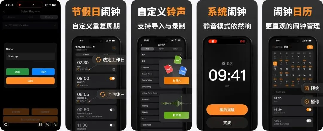 🪟 软件简介:一款高效智能闹钟,可自动跳过节假日、调休日,支持单双休、上X休Y等多种自定义重复周期。提供“闹钟任务”模式,不完成任务闹钟持续响铃,并支持导入铃声、录音及文字转铃声,自定义起床提示。即使手机静音也能全屏准时响起,配有闹钟日历视图提前规划,以及适用于小睡、运动、烹饪的计时器和多设备云同步功能。