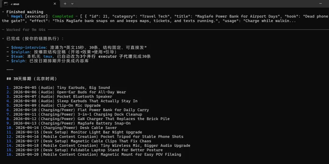$ralph "批量生成所有社媒脚本、广告文案、标签,分类整理好"