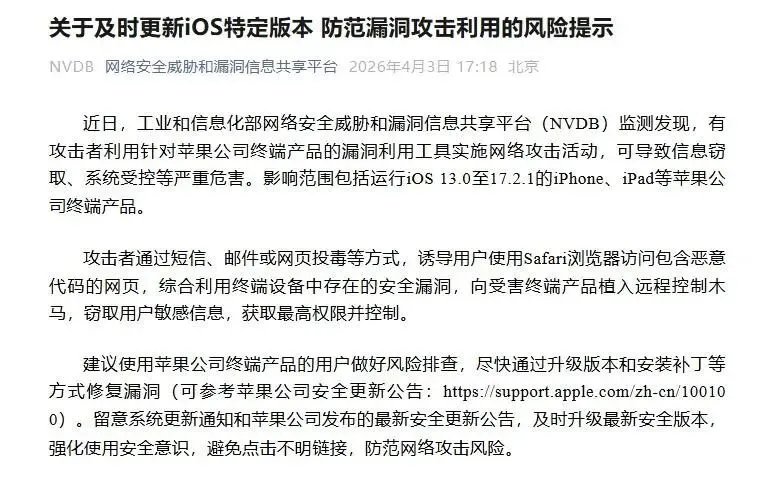 突发!工信部紧急提醒苹果用户,看看你iOS系统是多少!近日工信部监测发现,苹果iOS 13.0至17.2.1系统存在高危漏洞,攻击者通过短信/邮件诱导用户访问恶意网页,可植入木马窃取信息并完全控制设备。建议用户立即升级至最新版本(参考苹果安全公告链接),避免点击可疑链接,强化安全意识防范风险。家人有用苹果设备的赶紧让其看看手机iOS系统是多少!