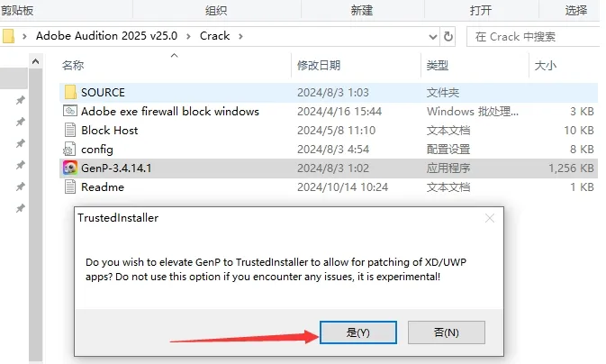 12. 当弹出对话框时,选择“是”。如果出现错误提示,请关闭并重新运行注册机,选择“否”继续。