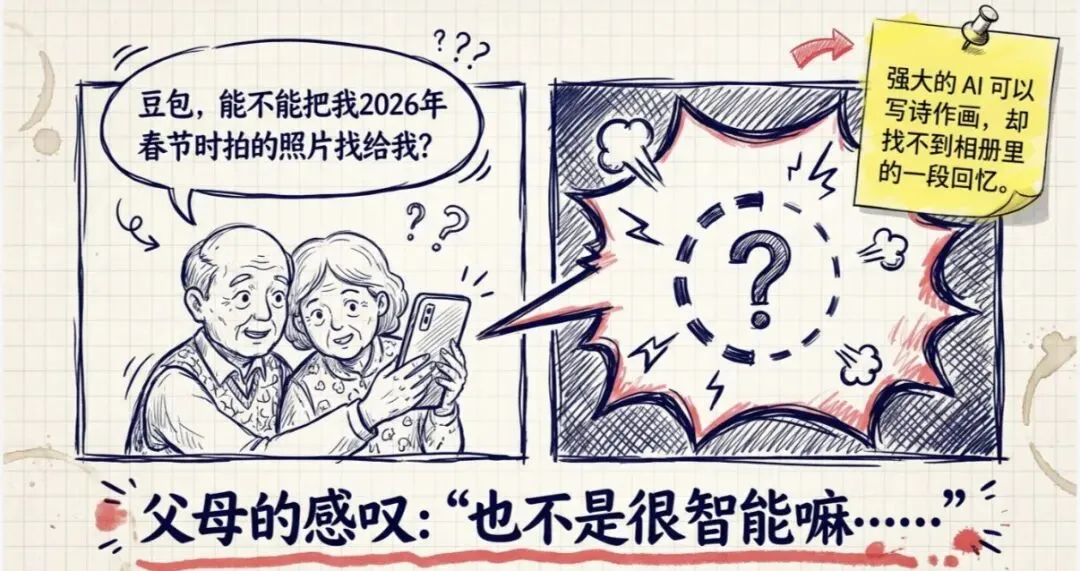 过了一段时间我回老家,无意中看到他们在问豆包:"能不能把我春节时拍的照片找给我?"