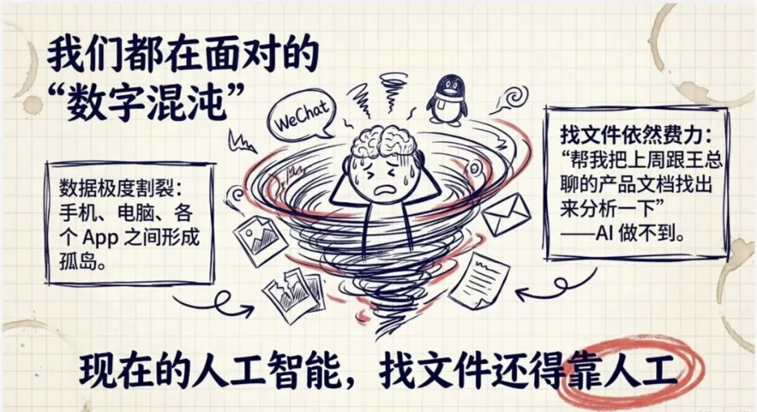 这几年的 AI 火热,有 ChatGPT、Gemini、Cloud,或者是元宝、豆包还是千问,很多人玩得不亦乐乎。但是想让它做一个最基本的事情,比如说"把上个星期我跟王总聊的一个产品文档找出来分析一下",很难。