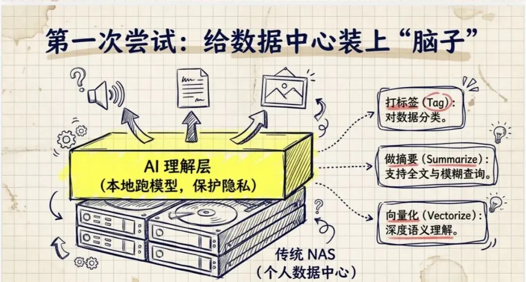 我们把这一层叫做**"AI 理解层"**。在传统 NAS 的基础上增加了一层 AI 理解层,并且是本地 AI 模型运行的,所以数据安全和隐私不需要担心。