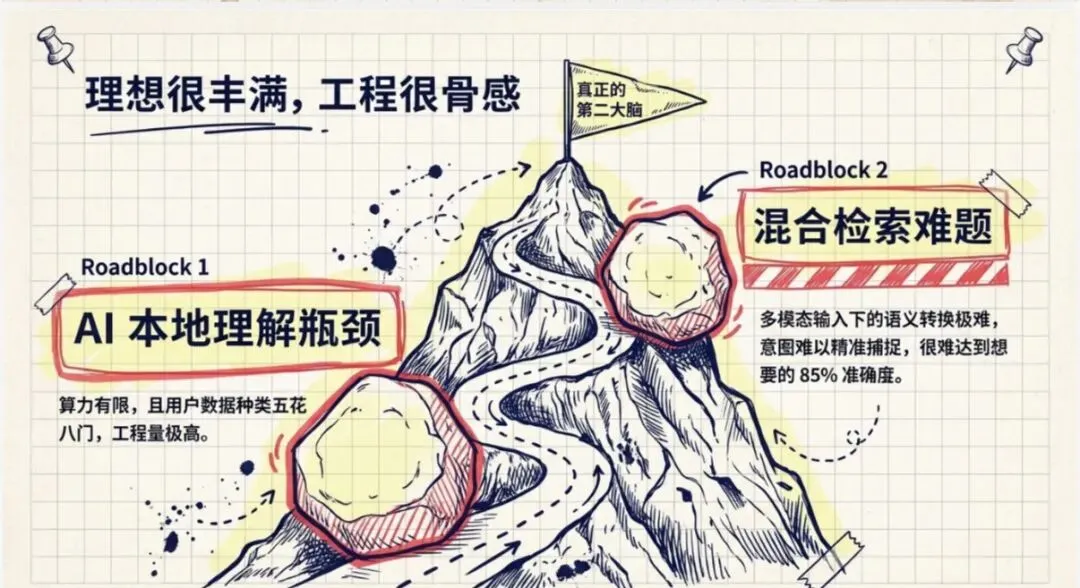 我相信很多人,数据都是分散的:手机上有、电脑上有、QQ 里有、微信里有、邮件里有,还有很多是散落的——拍的照片、随手写的文字、手写的笔记,也可能是电子版的。这些零零散散全是信息,想让 AI 把这些数据有效地整理起来、管理起来,挺难的。