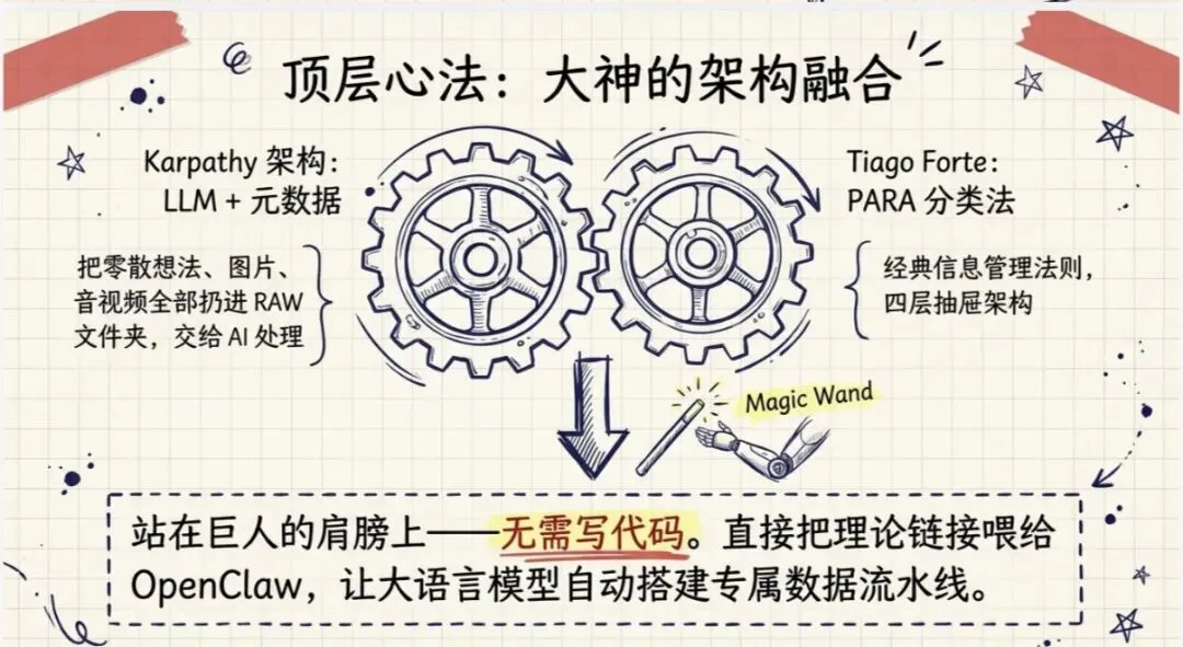 他就说用这个LLM + 元数据,他把各种数据啊,包括图片呀、音视频呀、文档呀、链接呀、自己的一些想法呀,都扔给大语言模型啊,扔给他的这个 OpenClaw。