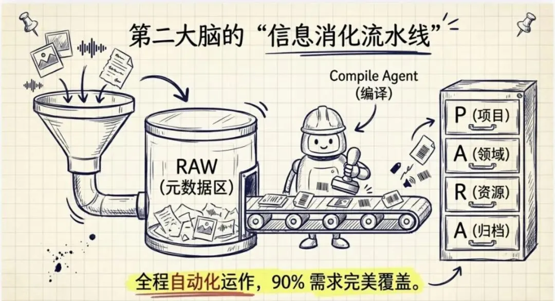 然后这个文件夹呢,就会由一个专门做数据处理的 Agent 去做处理,他的意思叫编译(Compile)。