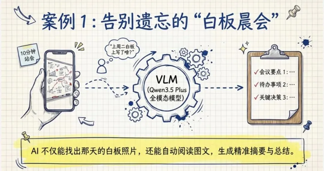 这个 OpenClaw 呢,它就会把我白板上这些内容啊,用这个VLM 模型(视觉语言模型),它自己会知道怎么调的。我给它配的也是那个 Qwen3.5 的 Qwen3.5 Plus 全模态模型,然后它就会理解这个内容,然后给我存好。