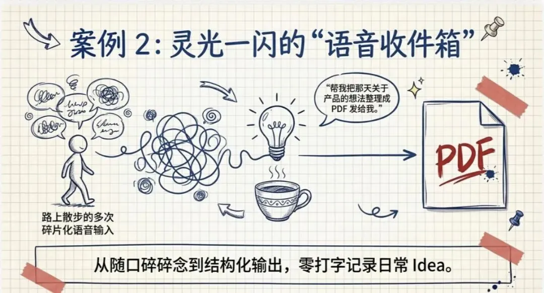 "把我那天有关于这个产品的一个什么想法,这个我当时给你发录音了,你帮我找出来,把这个想法的内容整理好啊,整理成一个 Word 文件或者是 PDF 文件,然后发给我。"