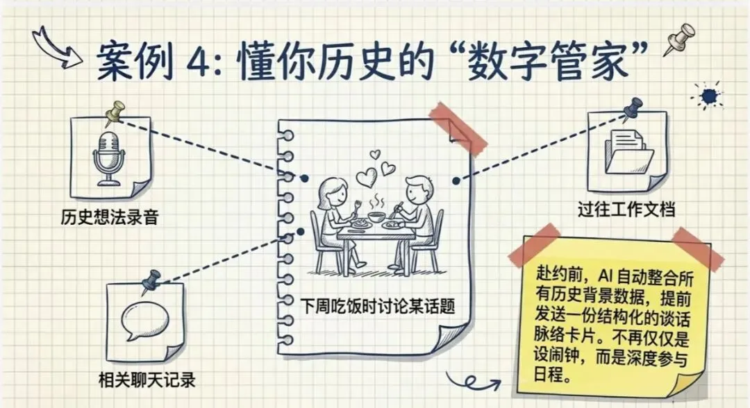 "今天你要跟谁去吃饭,讨论什么话题,然后这相关的话题和你之前的工作呀,或者什么想法呀,有一些关联,他都给你整理好。"