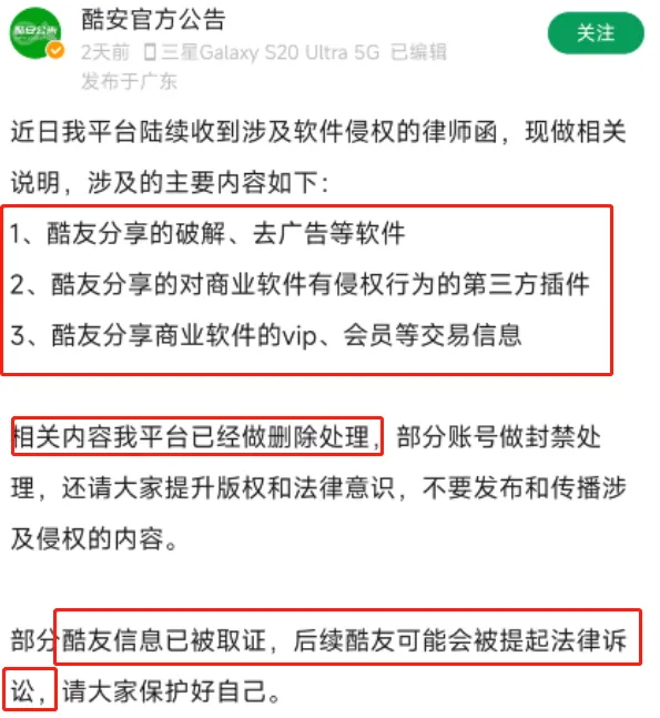 最后还提醒了一些酷友“部分酷友信息已被取证,后续酷友可能会被提起法律诉讼,请大家保护好自己”。
